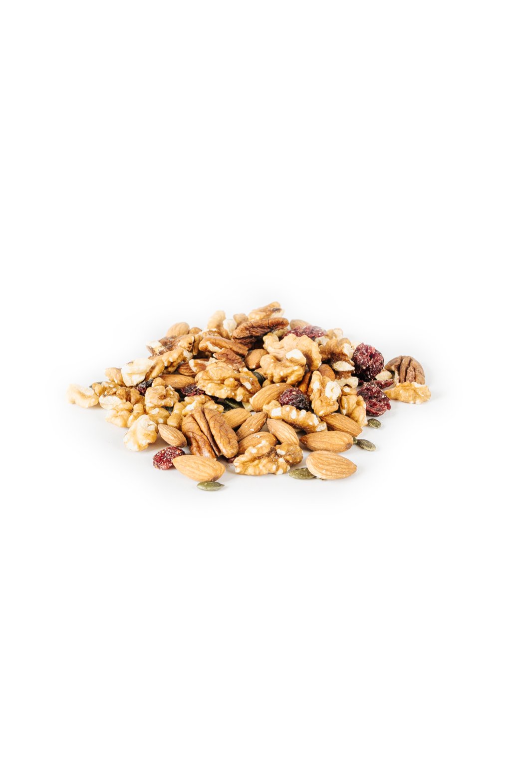 vlašská jádra 40 %, mandle natural 25 %, pekanové ořechy 15 %, dýňová semínka 10 %, klikva USA (juice-sweetened, měkká) 10 %